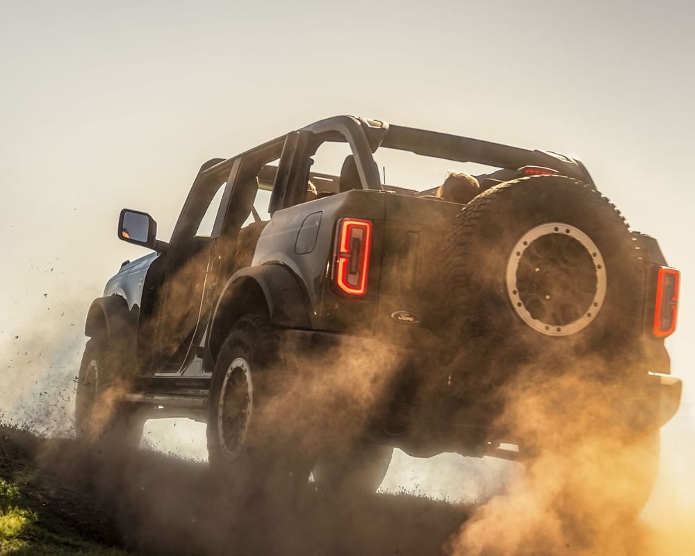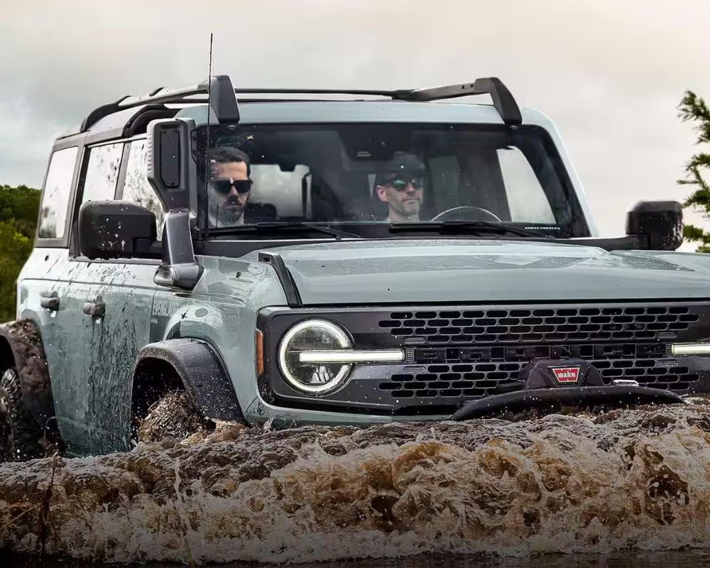 The Bronco’s exterior is a masterclass in rugged style and functionality. Its iconic design features a sturdy build, bold grille, and distinctive round headlights. Available in two- and four-door configurations with multiple roof options, the Bronco can be tailored to match your adventurous lifestyle. The Badlands trim, with its heavy-duty modular front bumper, isn’t just about looks – it’s built to tackle the toughest terrains head-on.