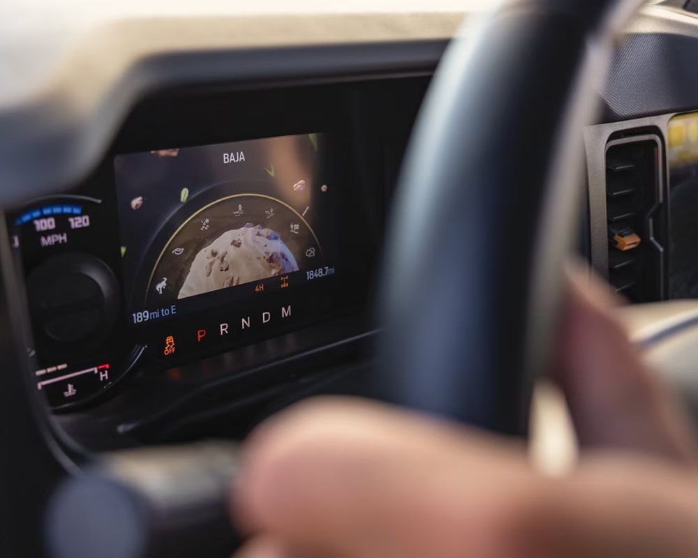 Step inside the Bronco, where adventure-ready design meets premium comfort. The new 12.0-inch touchscreen is your command centre, seamlessly integrating with Ford's SYNC 4 system to keep you connected and entertained. The Bronco’s interior adapts to your needs with options like leather upholstery for a touch of luxury or marine-grade vinyl seats for rugged durability. Removable doors and roofs transform your drive into an open-air escapade.
