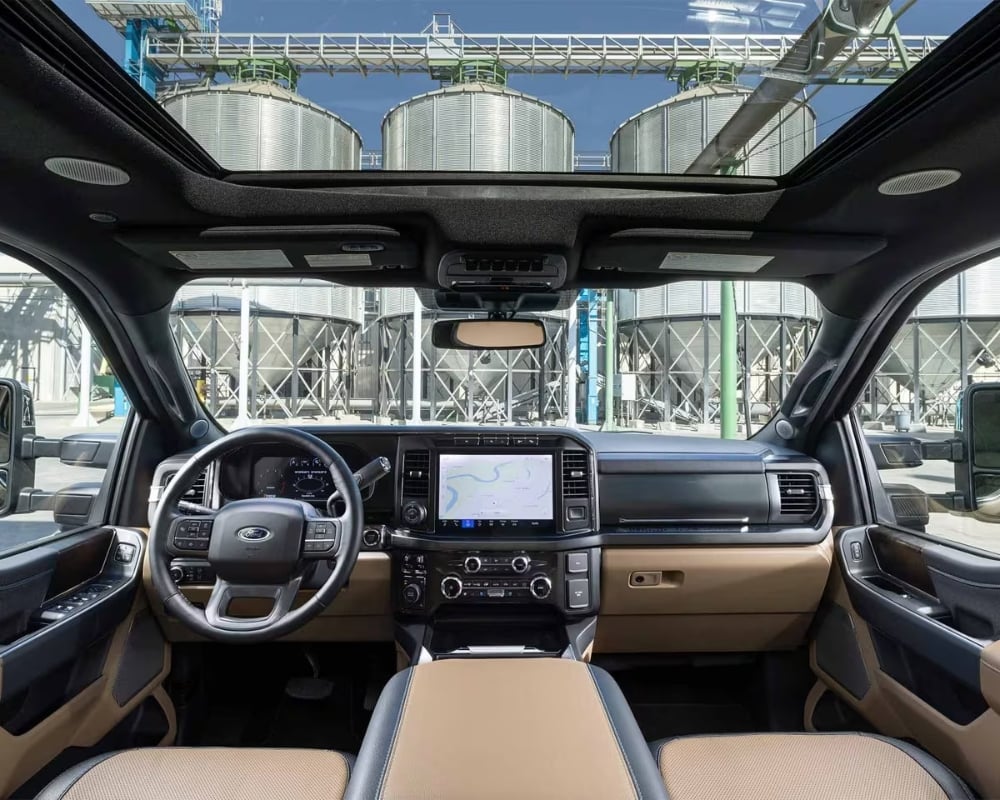 Step inside the Ford Super Duty, and you'll find an interior that combines rugged durability with modern comfort. The spacious and cozy cabin offers seating for up to six passengers, making it ideal for work crews or family outings. Premium materials, including leather-trimmed seating, add a touch of luxury, while ample storage options make organizing tools and personal items easy.